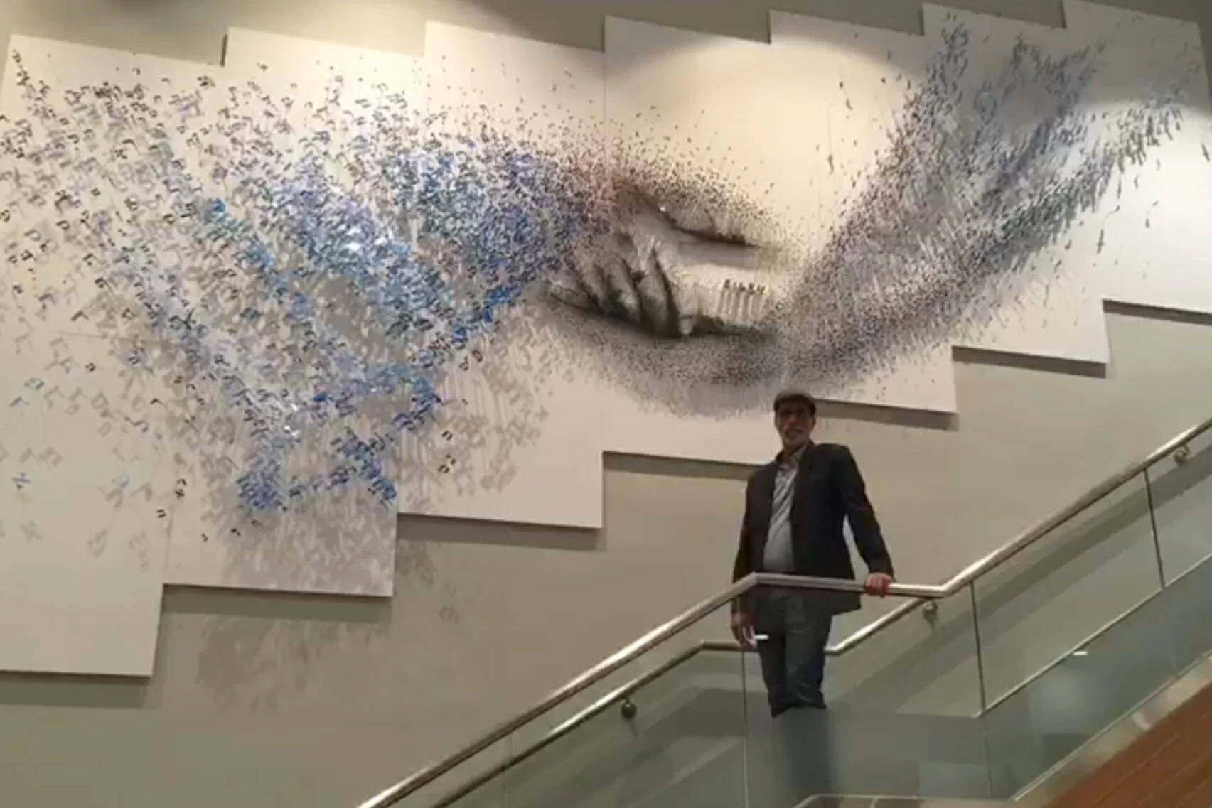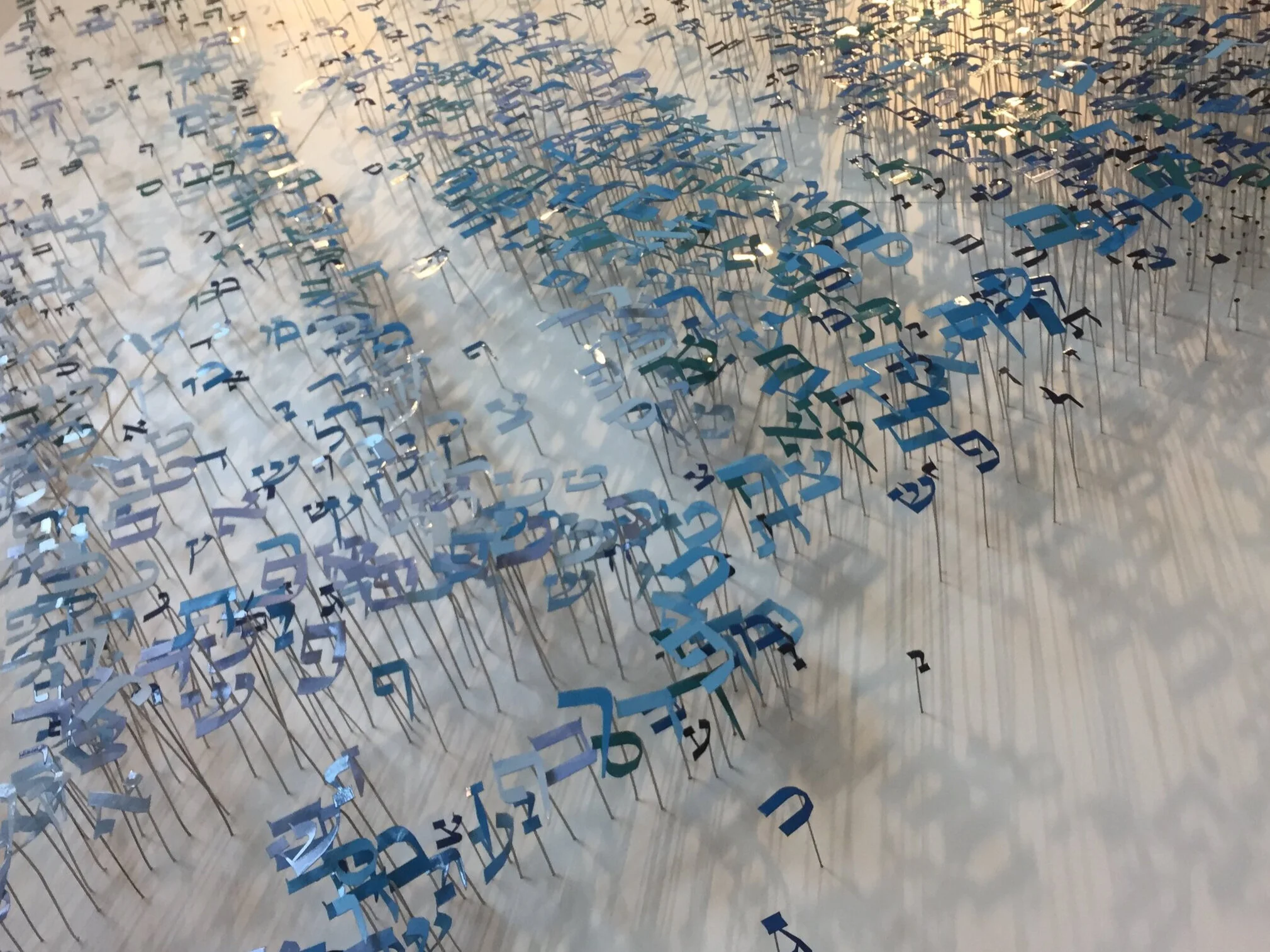 Yet we are also known as a persecuted people, though this, too, unified us. The sefer Torah in the art work depicts both sides of this equation, the glory and the nightmare. Our experience fluctuates between these two valences, now one, now the other. The Hebrew letters, shown here forming the Torah, exists as it were almost independently of ourselves. In more recent times we have passed through the holocaust in which an attempt was made to wipe out not only our physical existence but also our culture. Now our fortune has changed in the image of Israel, created out of those same letters. Like the mythical bird, the phoenix, that is burnt but arises again out of its own ashes, the Jewish people is thus reborn in the shape of a vibrant Jewish state.